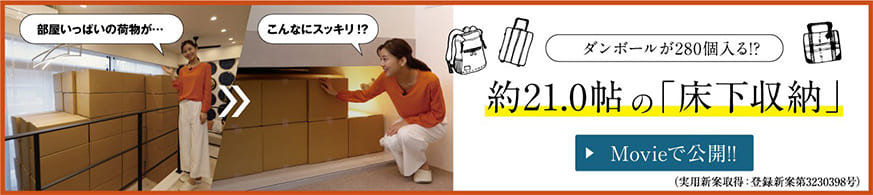 室内に高低差をつけ床下収納を設けた『SKIRAGE (スキップフロア&ストレージ)』。高い天井の伸びやかな開放感と、ハイサッシから差し込む溢れる光が心地よい時間を創出します。さらに、床下にはシーズンオフの衣類や家電等、普段使わない荷物等を収納できる便利な床下収納空間を実現しました。