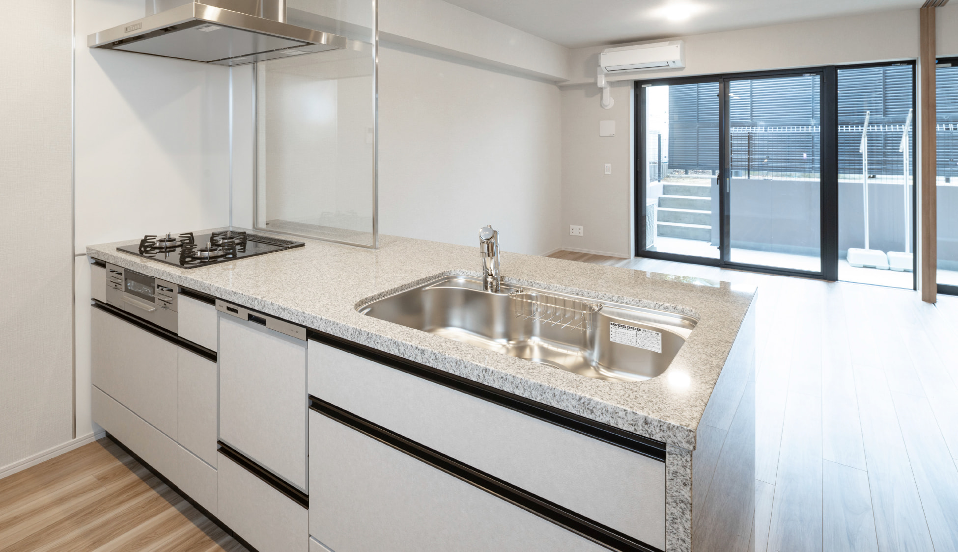 キッチンカウンターのワークトップには、美しく清潔感や上質感にあふれる天然御影石を採用。耐久性が高く、傷が付きにくい素材です。