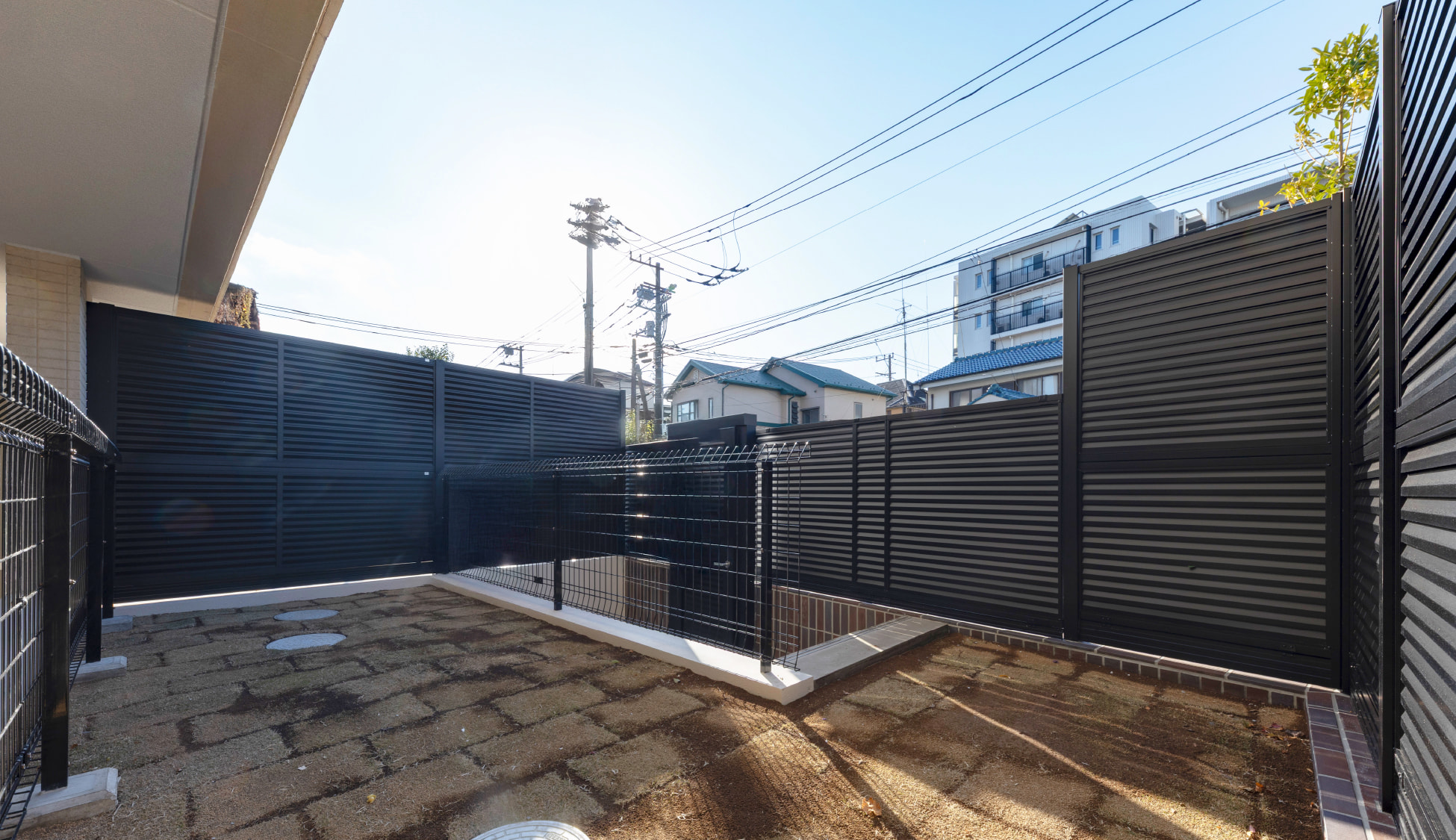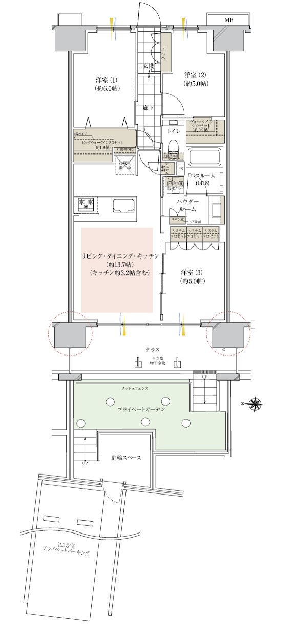 ※専有部分リノベーション/乾式間仕切り新設を行い3戸専有住戸新設。間仕切り及び壁・天井クロス貼り新設。各居室、床フローリング・二重床新設、木製巾木新設、リビングに床暖房新設、各室木製建具(枠・金物・扉)新設。ビッグウォークインクロゼット・ウォークインクロゼット新設、枕棚・可動棚、ハンガーパイプ新設、折戸(扉・金物・枠)新設、キッチン システムキッチン・食器洗い乾燥機新設、レンジフード新設・キッチンバネル新設、ディバイダー新設、パウダールーム ユニットバスー式(浴室換気乾燥機含む)新設、洗面化粧台及び三面鏡新設、三面鏡下部鏡・タオル掛け新設、リネン庫新設、防水パン及び上部吊戸棚新設、床クッションフロア及びソフト巾木新設、天井換気扇新設、トイレ 洋風大便器及び温水洗浄便座新設、手洗いカウンター・吊戸棚新設、タオル掛け・ペーパーホルダー新設、床クッションフロア及びソフト巾木新設、天井換気扇新設、玄関ドア・プッシュブル錠他金物新設、玄関上框、玄関床・廊下床石新設(廊下は二重床)、木製巾木、床見切り材新設、分電盤新設、情報分岐スペース新設、インターホン新設、引っ掛けシーリングプレート、ダウンライト、感知器新設、コンセント・マルチメディアコンセント・電話アウトレット・スイッチ新設、給水・給湯管新設、ガス管新設、給気口スリーブフェイス(室内・室外側共)新設、エアコン用スリーブフェイス(室内・室外共)新設、アルミサッシ及びガラス・網戸(一部除く)新設、アルミルーバー面格子新設、窓額縁及びカーテンレール新設、外部廊下エアコン排水用溝新設、MB新設・塗装(一部)、外部壁タイル貼新設(一部)、天井塗装(一部)、テラス、壁・天井塗装(一部)、床長尺シート貼り及びエアコン用排水溝新設、スポットライト、給水栓新設、物干金物(置き型)新設、排水溝蓋新設、プライベートガーデン(階段・基礎躯体・タイル貼共)新設、目隠しフェンス及びアルミ扉(金物・枠共)、メッシュフェンス新設、芝新設、駐輪スペースコンクリート新設、プライベートバーキングアスファルト、区画ライン引き、駐車番号新設ほか各仕上げ工事一式