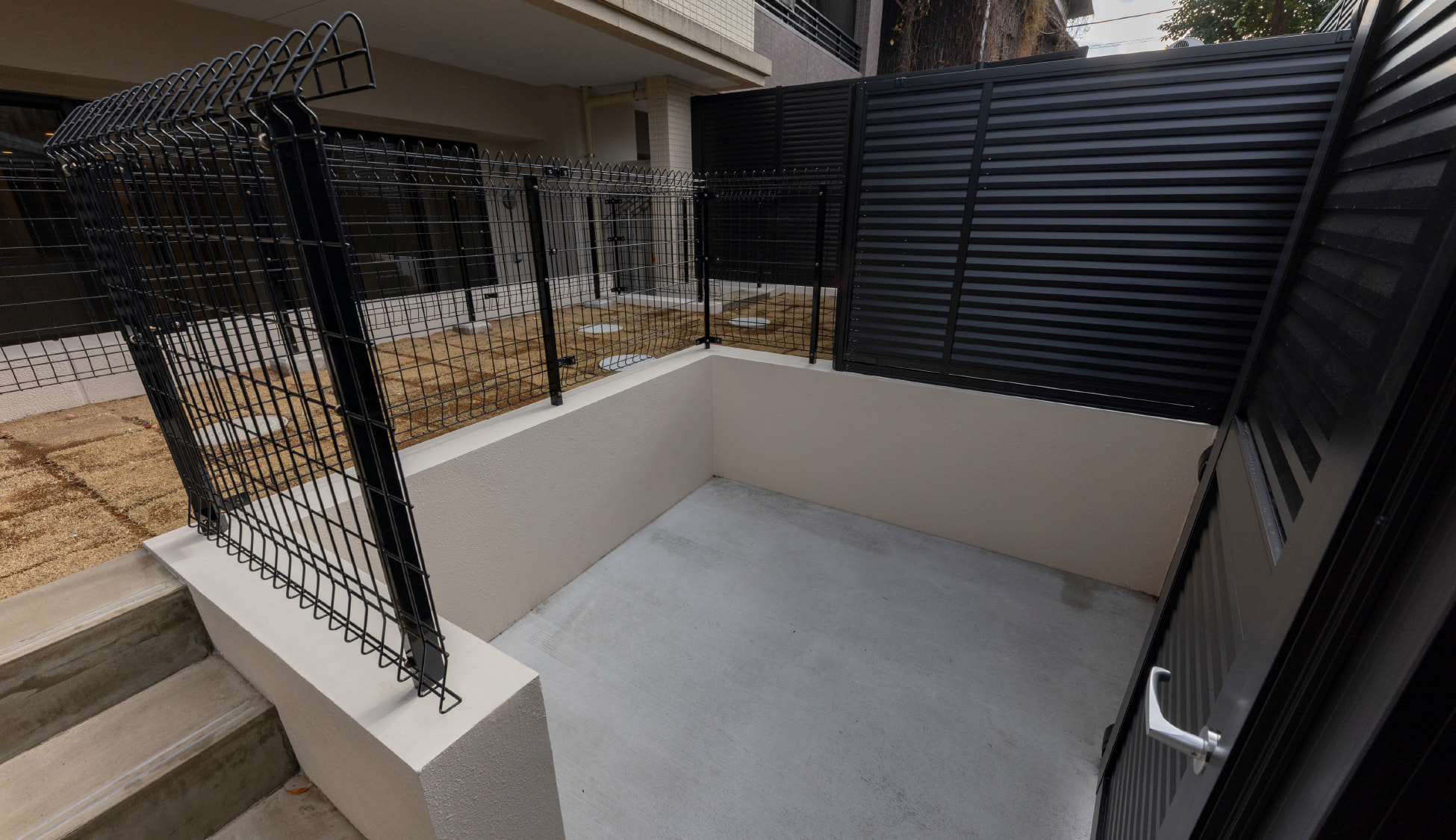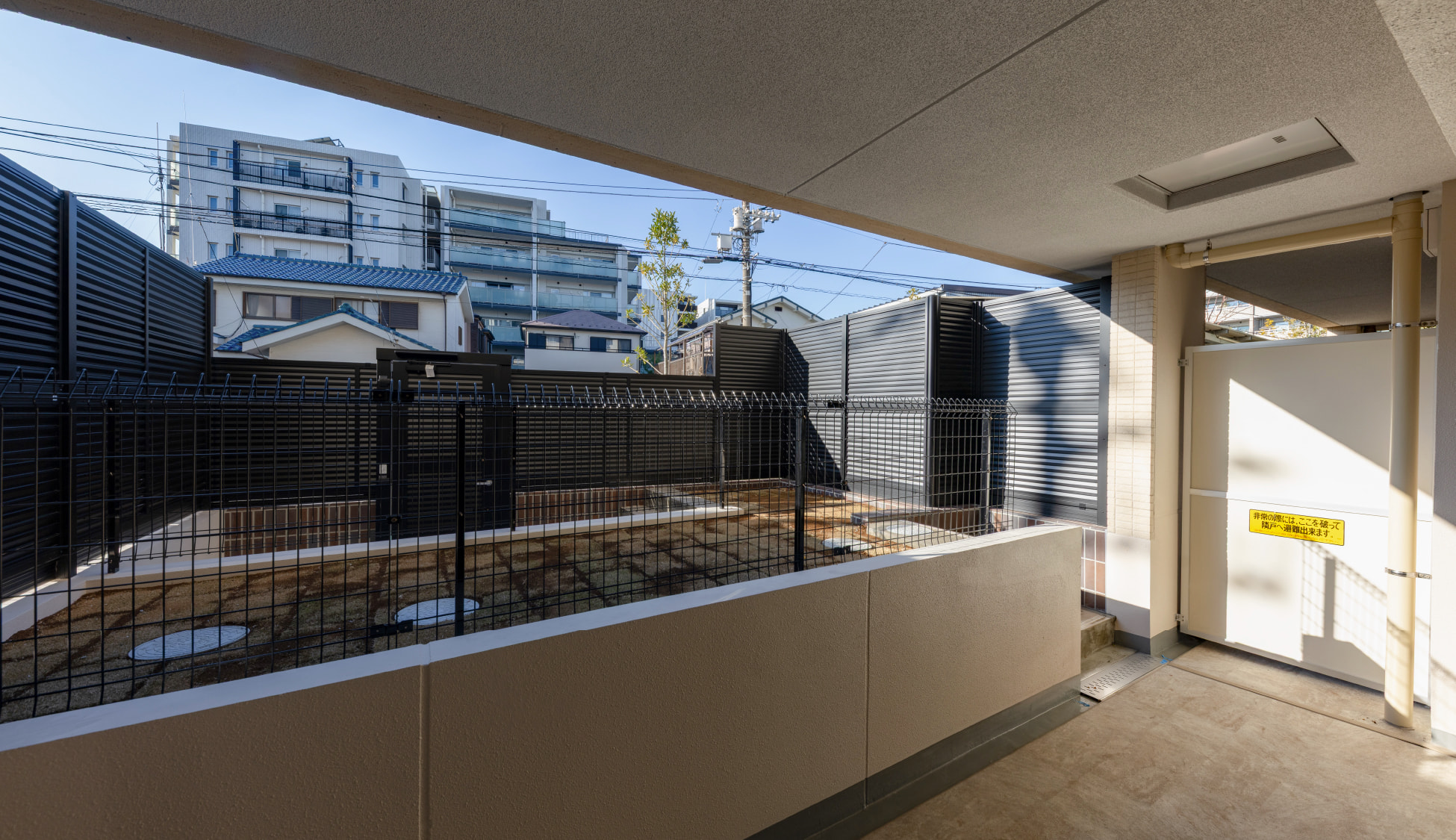 ※共用部分リノベーション/子育て支援施設を専有部分に改装。外部廊下に縦格子フェンス新設・アルミ扉撤去し広場入口にアルミ扉新設。排水溝蓋新設、排水溝ウレタン塗装(一部)