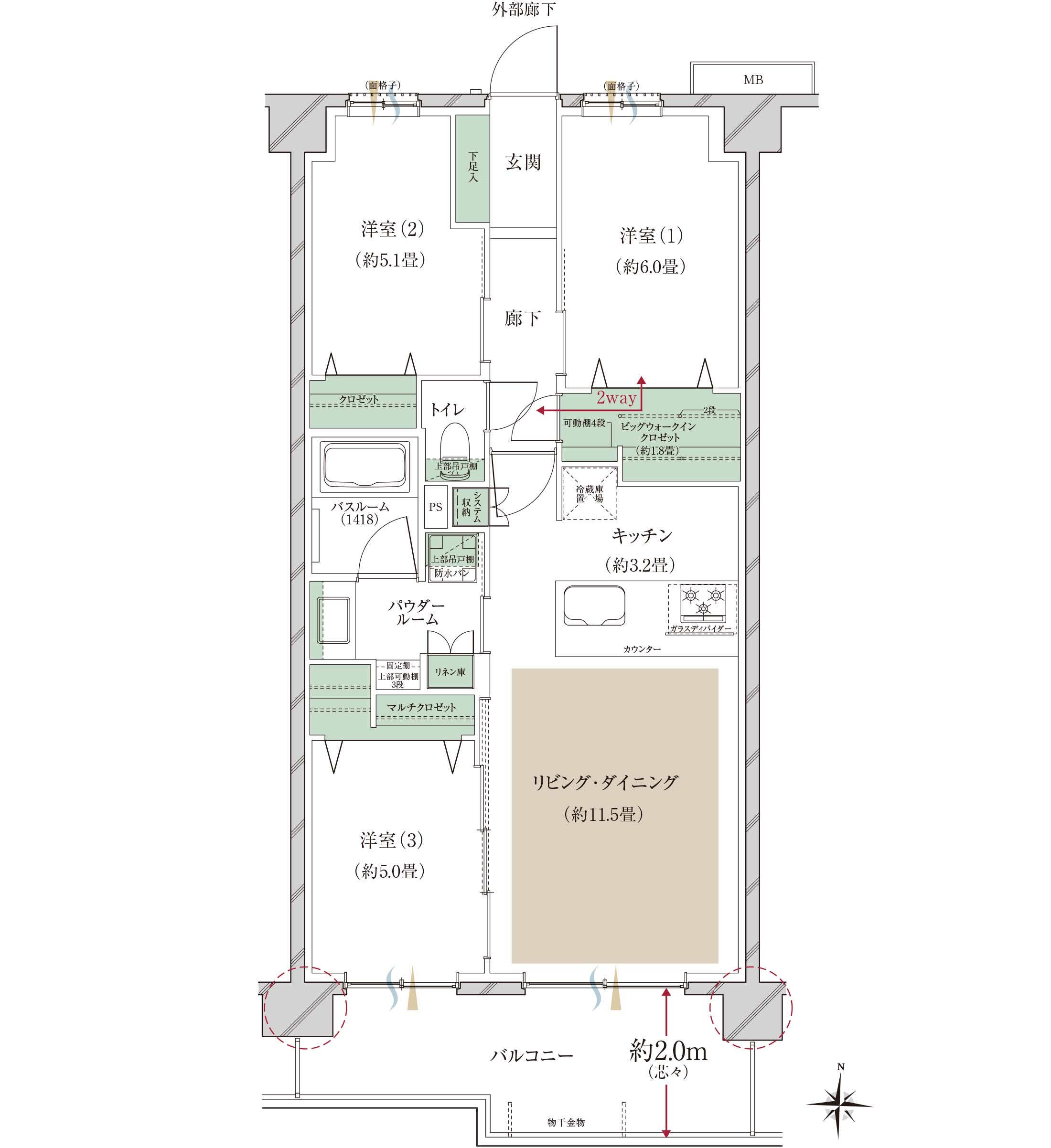 ※リビング・ダイニングの畳数表記については、リビング・ダイニングの扉より内側の面積からキッチンの面積を差し引いたもので算出しております。