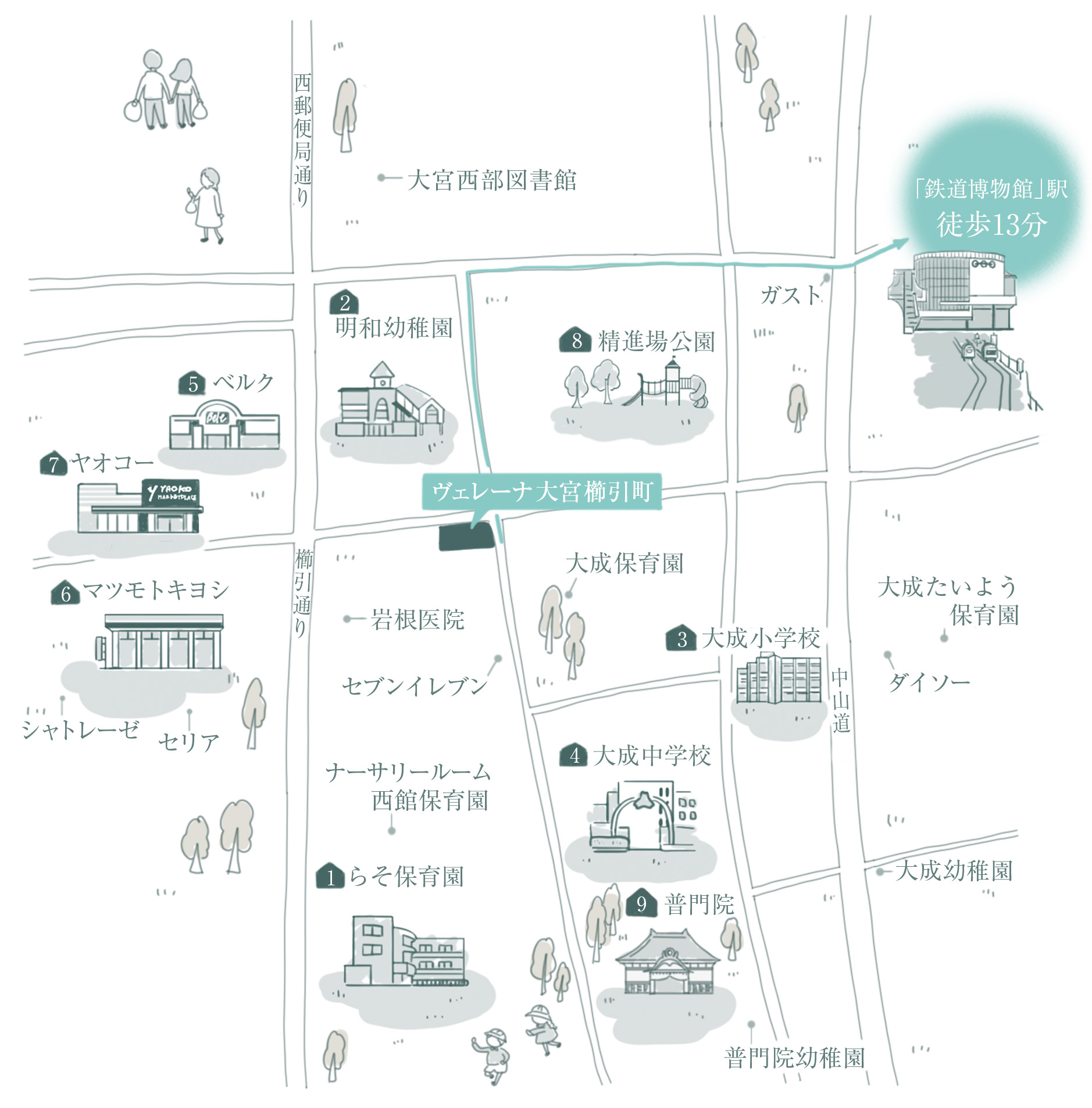 ※距離表示については地図上の概測距離を、徒歩分数表示については80mを1分として算出し、端数を切り上げたものです。