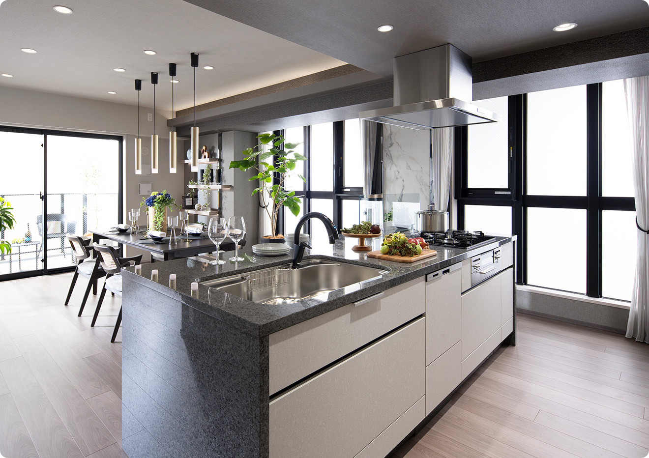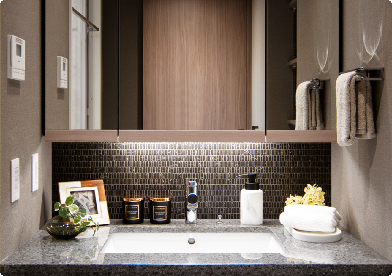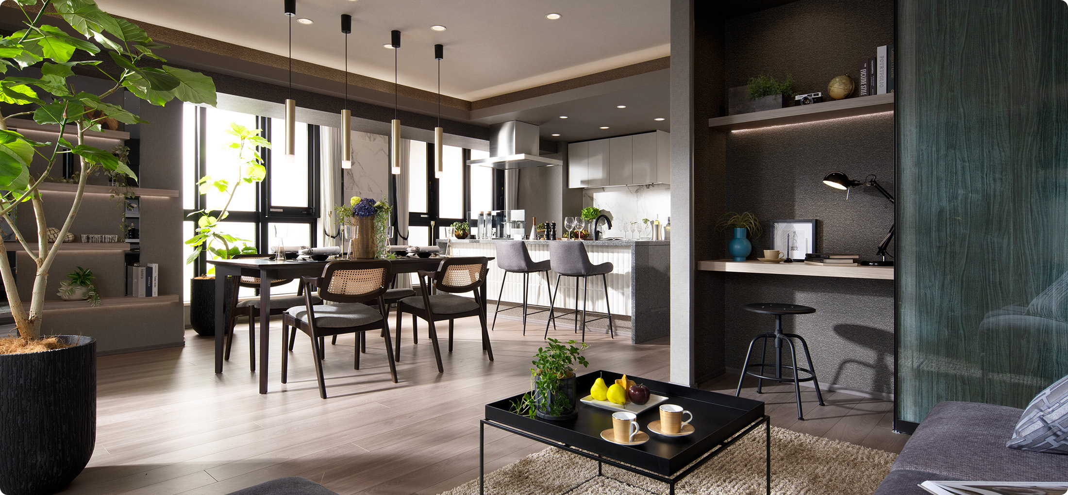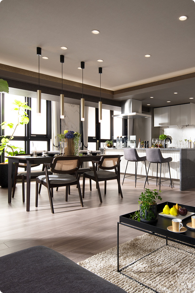※掲載の写真は、Rタイプのモデルルーム設計変更・有償オプションプラン(費用別途)を2025年4月に撮影したものに一部CG処理をしており、造作・仕様変更等のオプション品(費用別途)が含まれています。また、大きさ・形状・仕様等は住戸タイプにより異なります。家具・備品・調度品等は販売価格に含まれていません。形状・仕様・質感・色等は実際とは異なる場合があります。