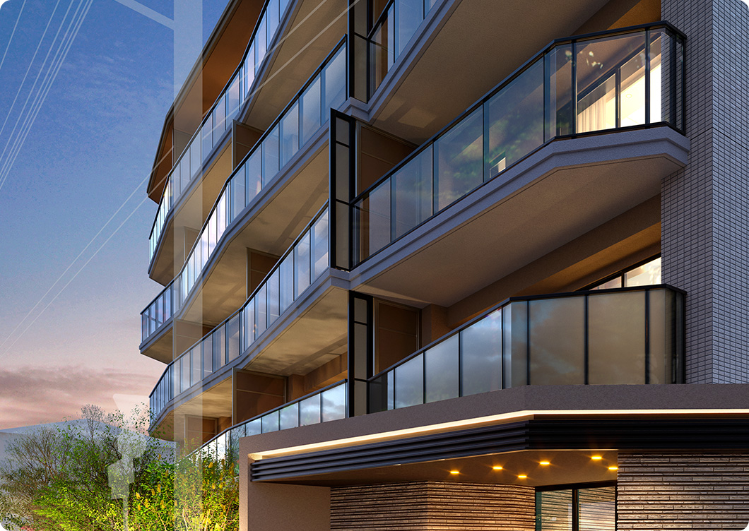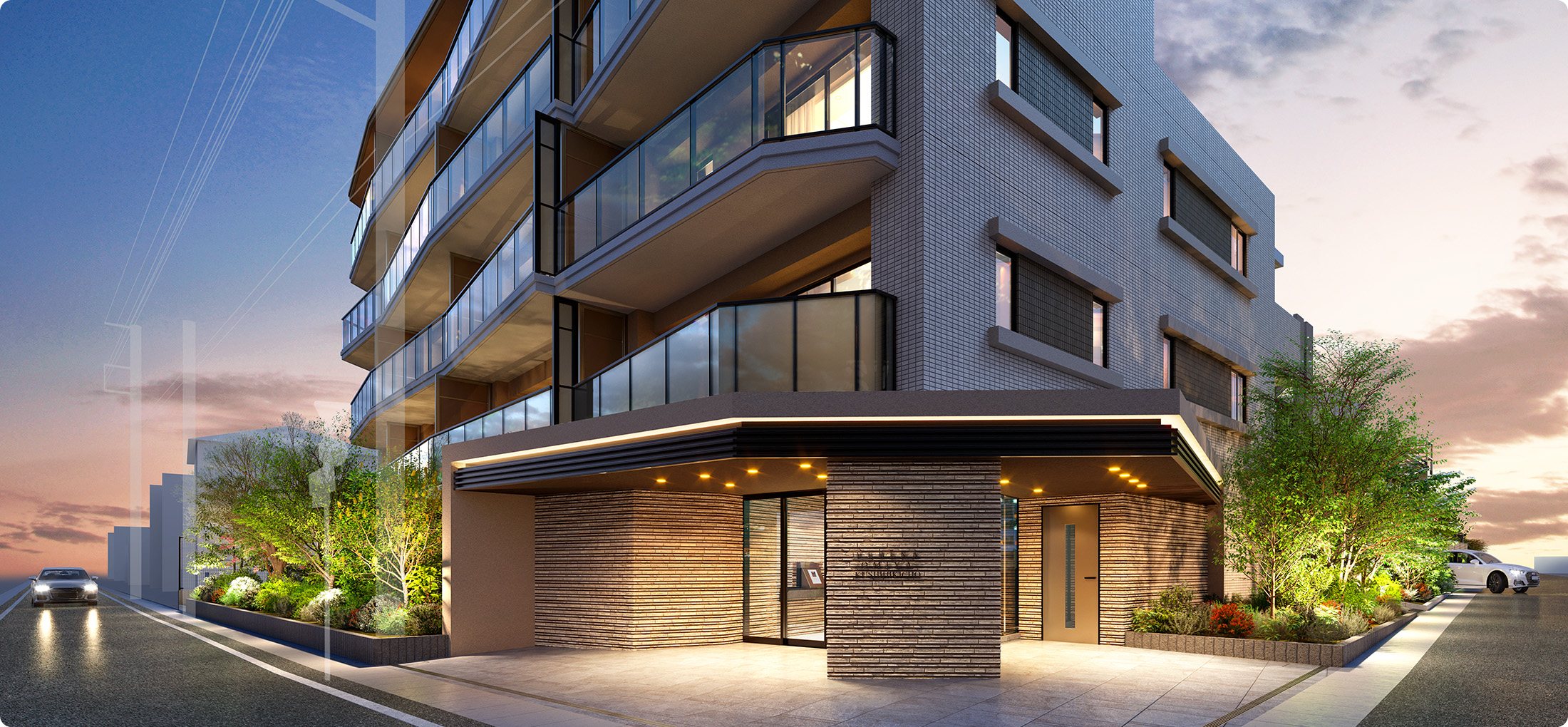 ※掲載の外観完成予想CGは計画段階の図面を基に描いたもので、外観・外構・植栽・形状・仕上げ等は実際とは異なる場合があります。またタイルや各種部材の質感や色等は実際とは異なります。外観形状の細部や設備機器等は表現されておりません。行政指導や施工上の理由等のため今後変更となる場合がありますので予めご了承ください。植栽は育成に必要な環境の下で竣工から一定期間を経た状態のものを想定して描いており、特定の季節を表したものではありません。なお、周辺建物・環境・電柱・電線・標識等は2025年3月時点の情報を基に白線等で簡略化して表現しており、今後周辺環境が変化した場合、将来に渡り保証されるものではありません。住戸内の家具・調度品は販売価格に含まれておりません。