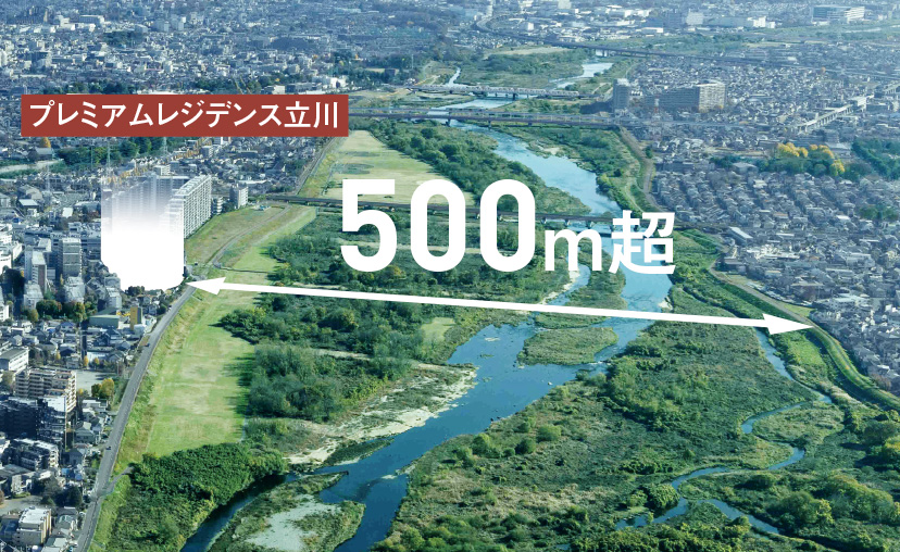※現地から対岸までの距離は国土地理院地図計測上の値となります。実際とは異なる場合がございます。※リバーフロントの開放感は南面を向いている住戸のみとなります。