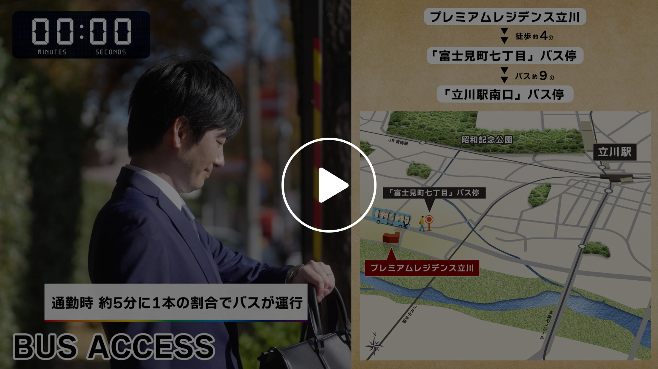 徒歩4分の「富⼠⾒町七丁⽬」バス停から「⽴川駅南⼝」バス停まではバスで9分。運⾏本数も豊富で平⽇の通勤・通学時(6:30〜8:30)には、約5分に1本の間隔でバスが運⾏しています。