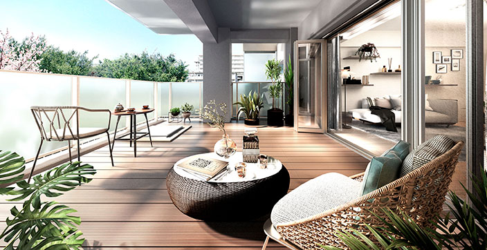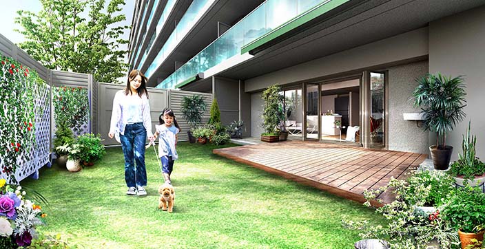 1階住戸さながらの外部空間は、セカンドリビングとしてカフェやランチを楽しんだり、観葉植物を育てたりと様々な用途で活用できます