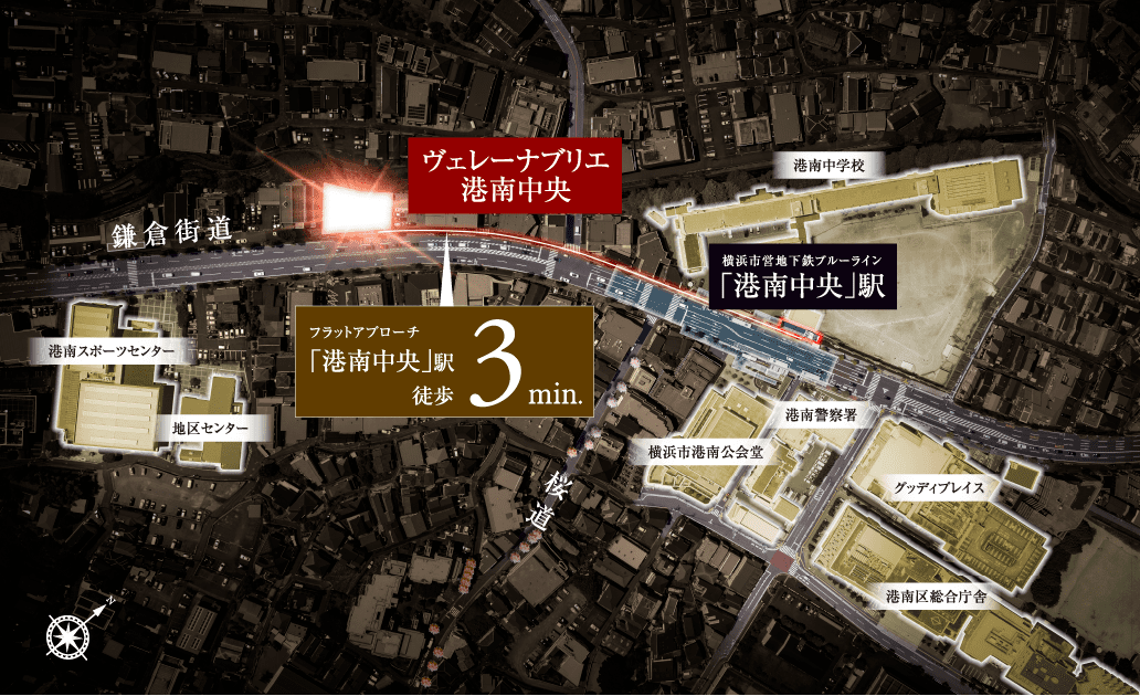 「ヴェレーナブリエ港南中央」は徒歩3分の「港南中央」駅まで起伏の少ないフラットアプローチでのアクセスが可能です。