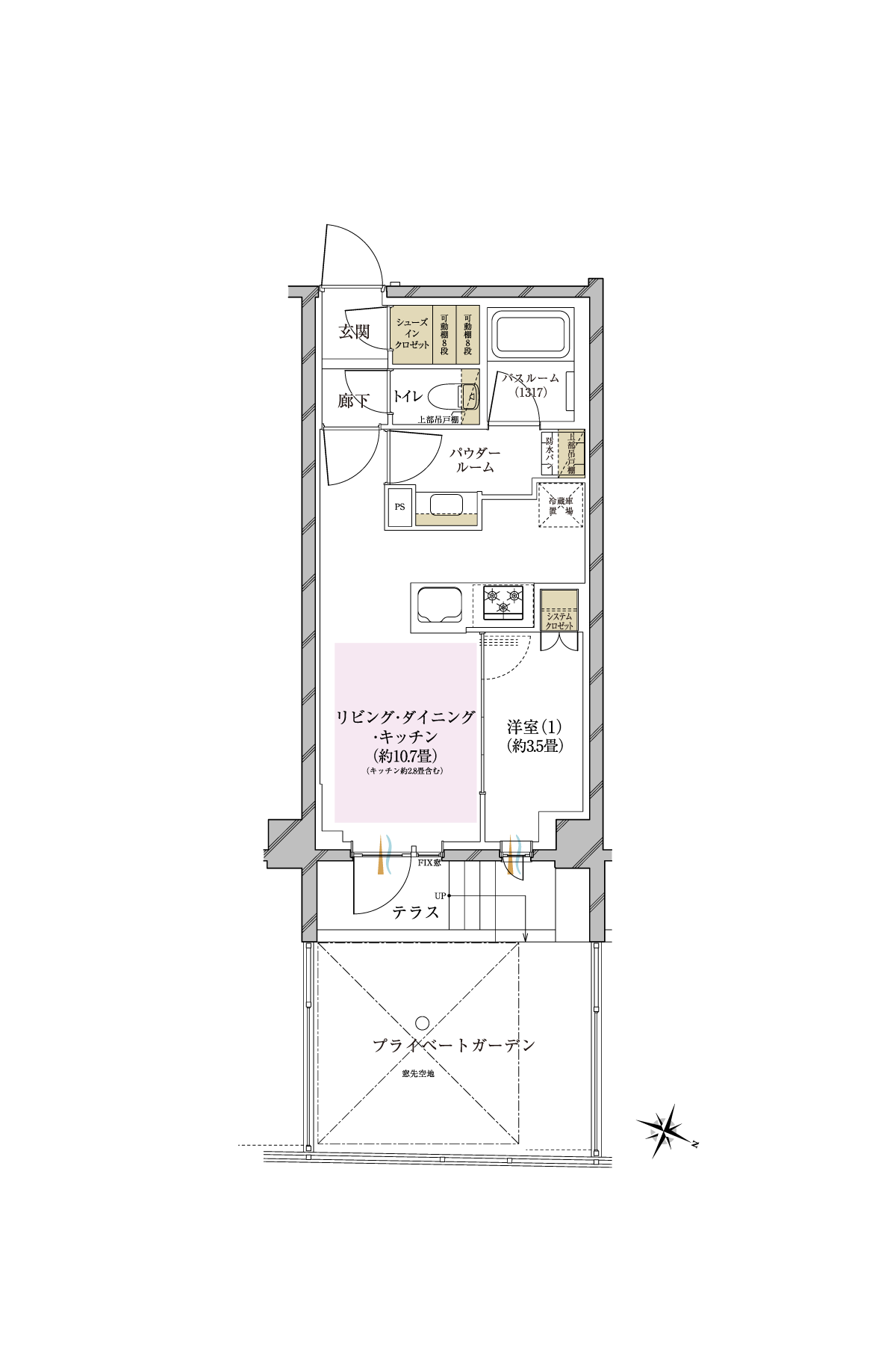 十分な広さを確保した1LDKプラン。リビング・ダイニング・キッチンに隣接する形で洋室(1)をレイアウトした生活動線を考慮し、シューズインクロゼット、ウォークインクロゼット等の収納も設けました。