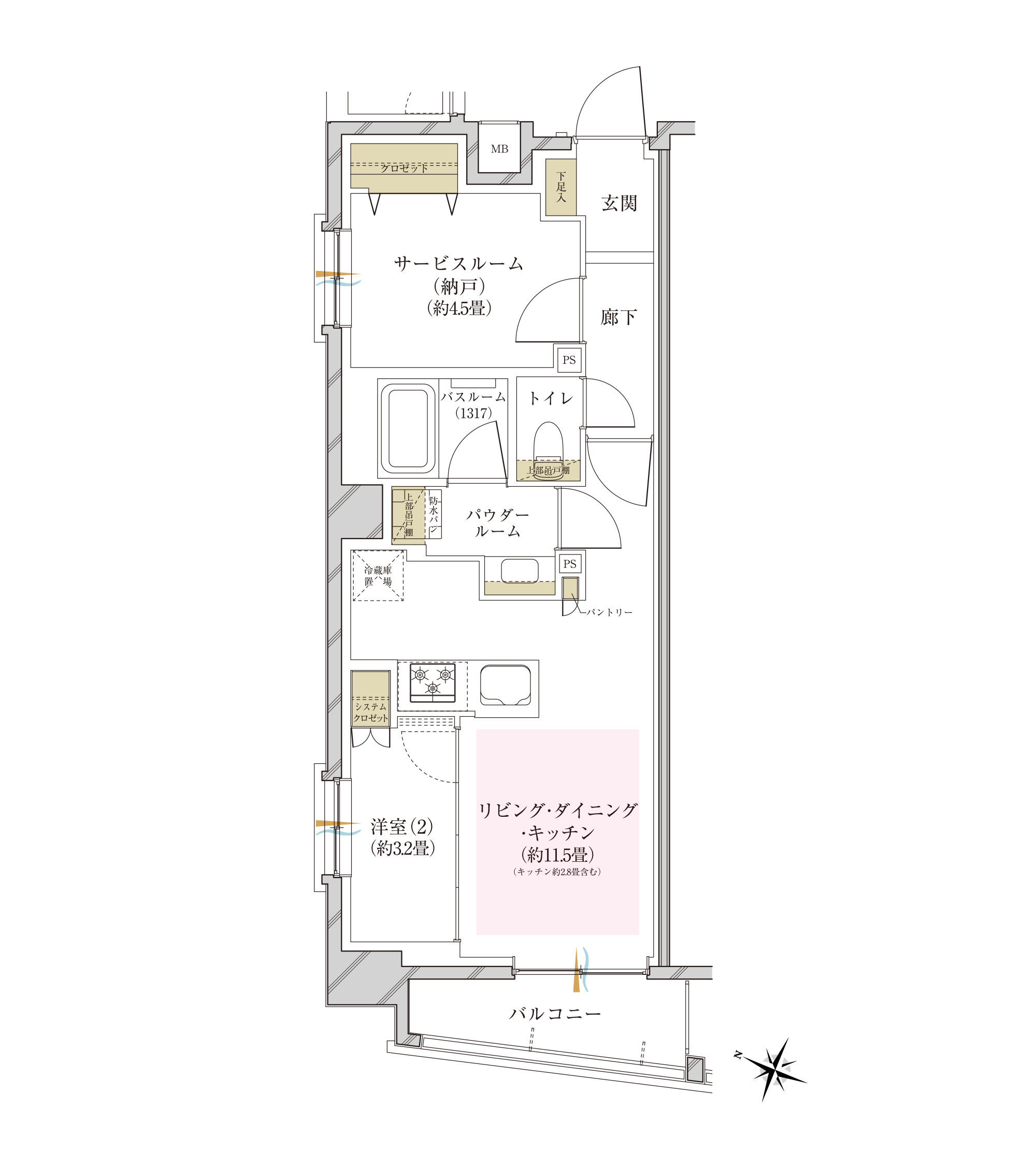 開放的なリビング・ダイニング・キッチンへ。S:サービスルーム(納戸)