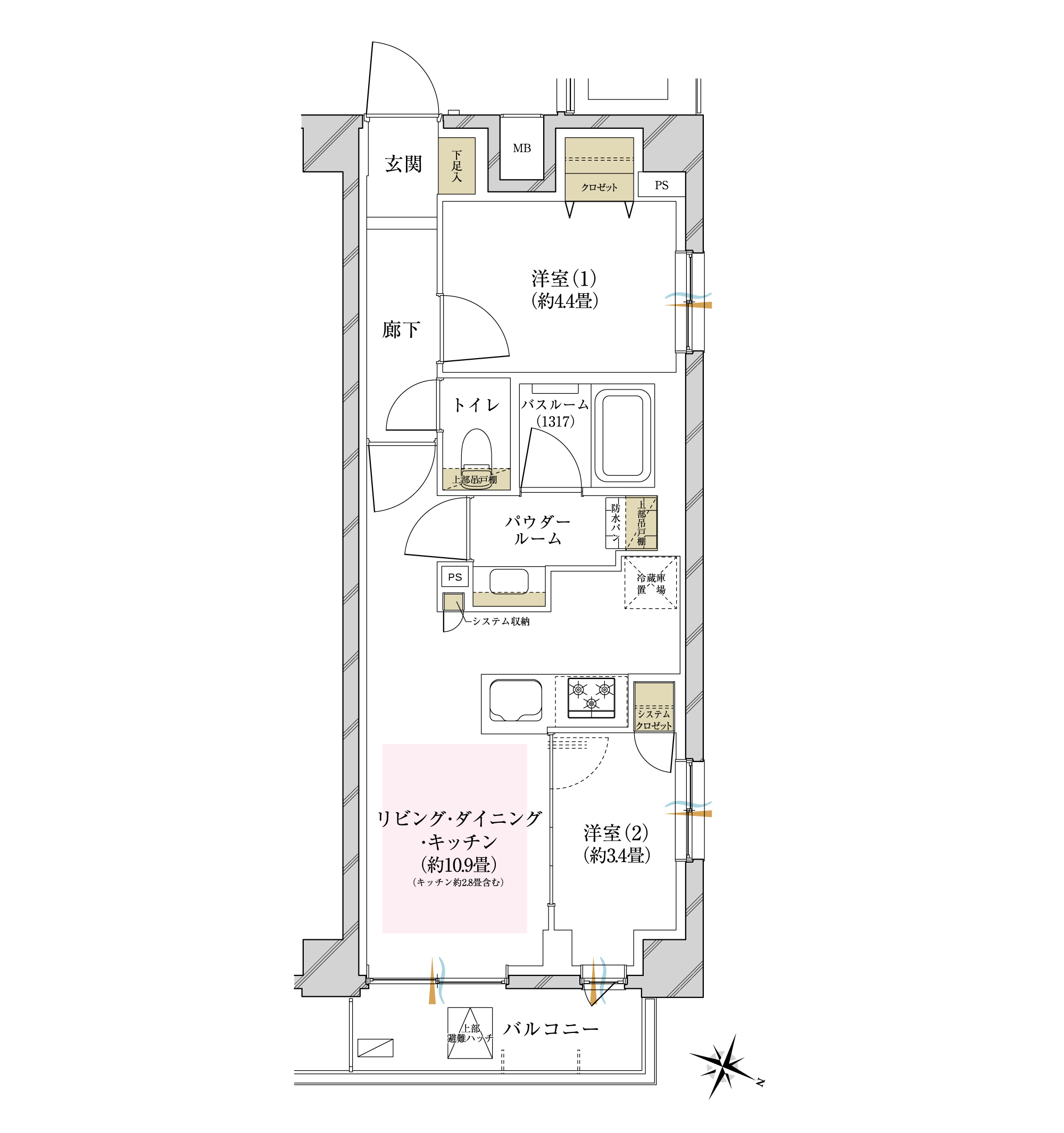 ※リビング・ダイニング・キッチンの畳数表記については、リビング・ダイニング・キッチンの扉より内側の面積にキッチンの面積を含んだもので算出しております。