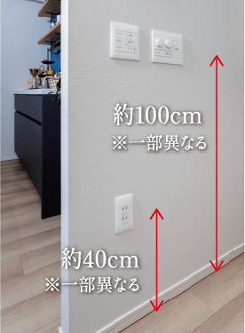 照明スイッチは床から約100cm、廊下・LD各1カ所のコンセントは床から約40cmの高さに設計。 ※一部異なる