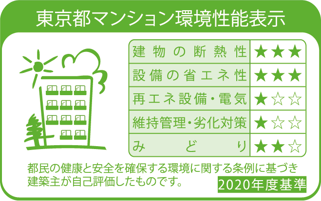 マンション環境性能表示は、特定マンションの建築主が東京都に提出する建築物環境計画書の内容に基づいて、5項目について3段階で評価されます。