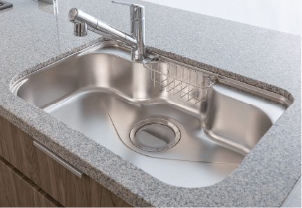 大型のシンクで中華鍋等も洗えます。シンク裏に制振材を備えているので、水はね音や振動も軽減する、使い心地のよい仕様です。