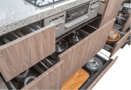 キッチンの収納には物が取り出しやすく整理しやすい、ソフトクローズ機能付きのスライド収納をご用意しました。※小物入れは除く
