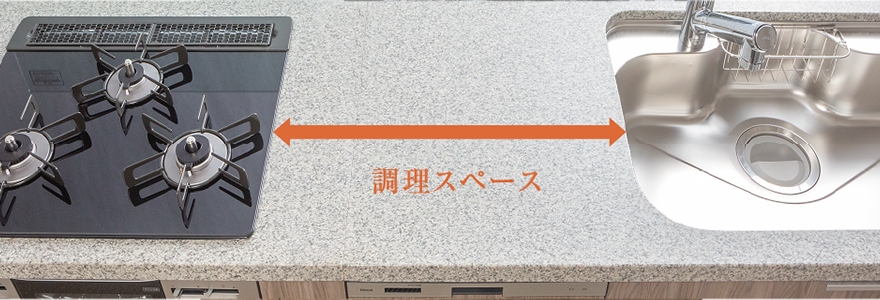 従来のシステムキッチンと比べてシンクとコンロを端に寄せることで、デッドスペースを抑えた調理スペースを確保しました。※一部住戸除く
