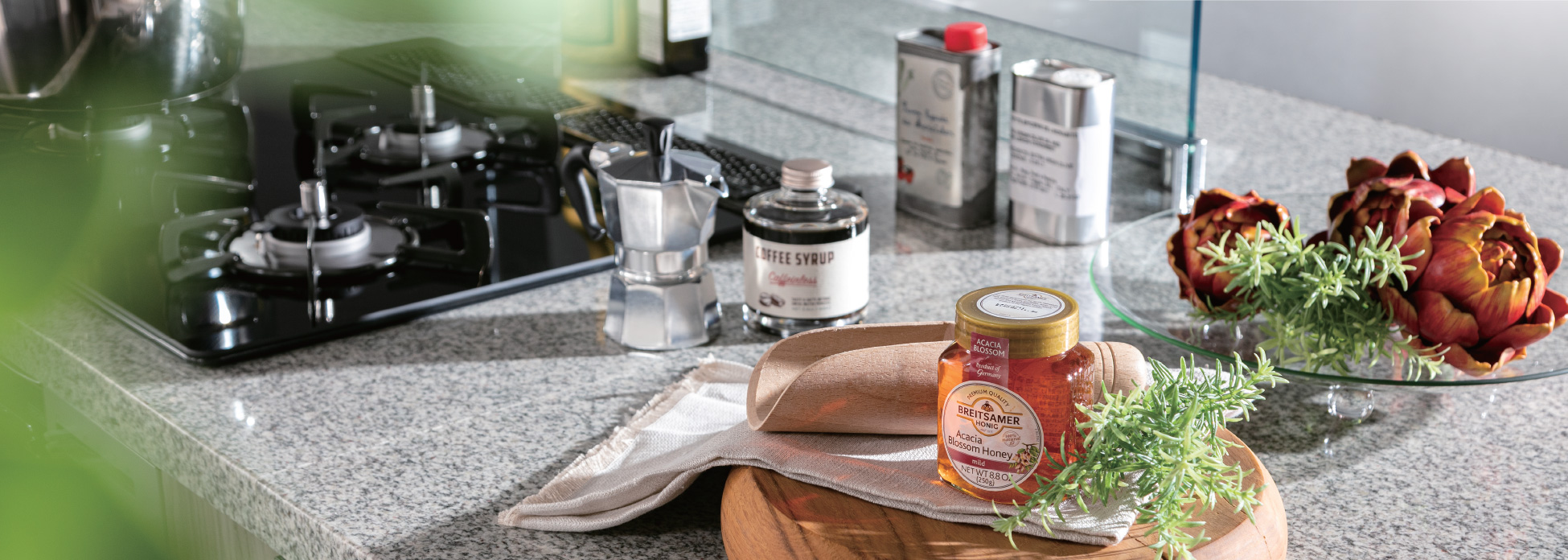 質感のある天然御影石のワークトップを採用しました。耐熱・耐候性等に配慮し、お手入れもしやすく、より長く美しさを保てる仕様です。 ※天板セレクトで人造石もご用意しています。(申込期限あり)