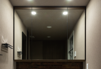 ミラー上下の框が木製建具との一体感を生み、収納としての機能も兼ね備えたミラーキャビネットです