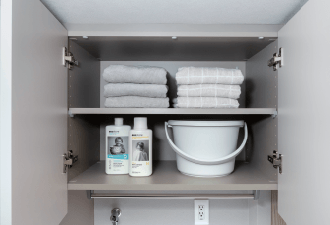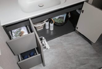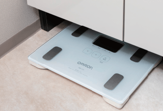 洗面化粧台の足元部分に、ヘルスメーターの収納スペースを確保しました。楽に取り出すことができ、収納もスマートです。