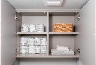 洗濯機置き場の上部に吊戸棚を設置。洗剤類のストックなど便利に使えます。また、ハンガーパイプも付いています。