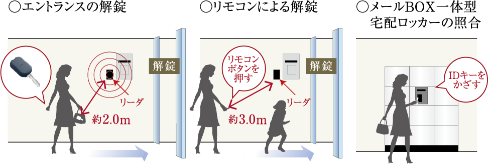 専用のラクセスキーをポケットやカバンの中に入れたまま約2mの検知でオートロックが解除されます。 ※各住戸に1本付属