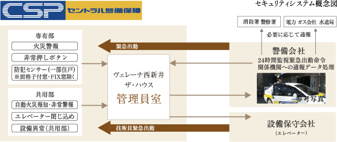 火災などの異常は、センサーが探知して自動的に通報。住戸内には非常ボタンも設置しています。