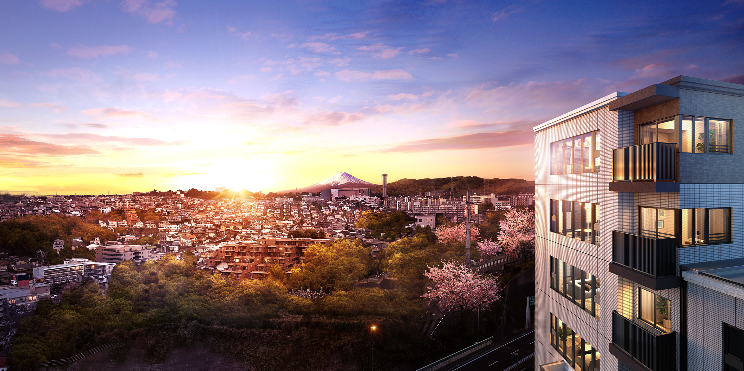 高台の突端に位置する敷地形状を考慮し、富士山を望む方向と南方向に抜けのある配棟を実現。