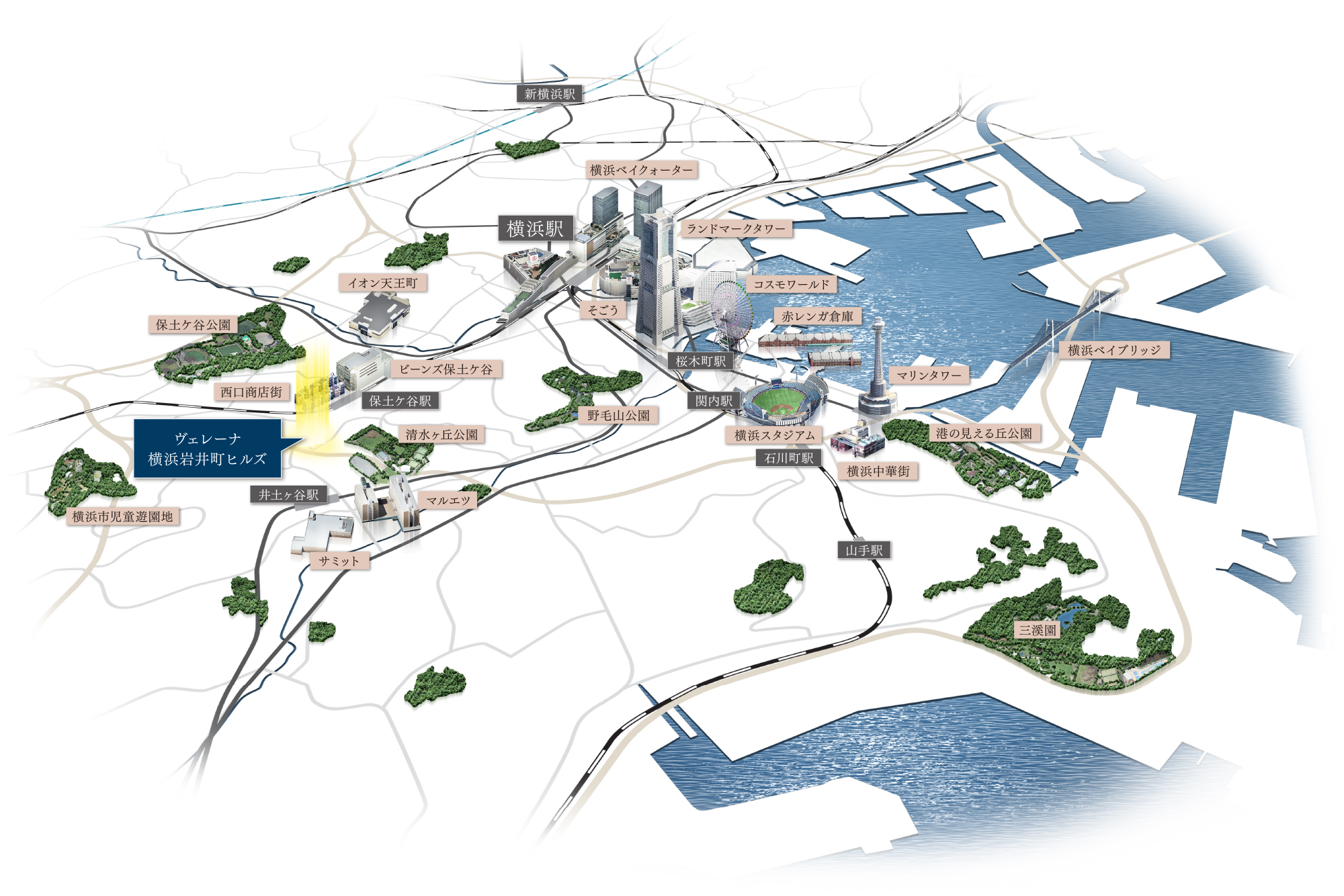 「ヴェーレーナ横浜岩井町ヒルズ」が位置するのは、「横浜」駅から直線約3.5km圏の住宅エリア。「横浜」駅へ1駅3分の利便性も相まって、横浜の賑わいを自在に使いこなす暮らしが叶います。