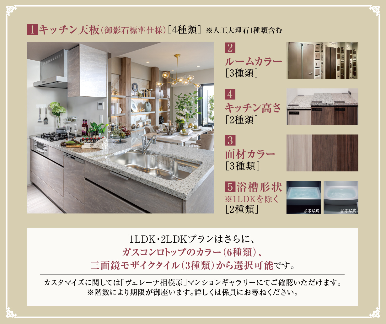 ※掲載のモデルルーム写真は、EOLタイプのモデルルーム有償オプションプラン(費用別途)、サンプル展示コーナーを2025年9月に撮影したものに一部CG処理をしており、造作・仕様変更等のオプション品(費用別途)が含まれています。また大きさ・形状・仕様等は住戸タイプにより異なります。