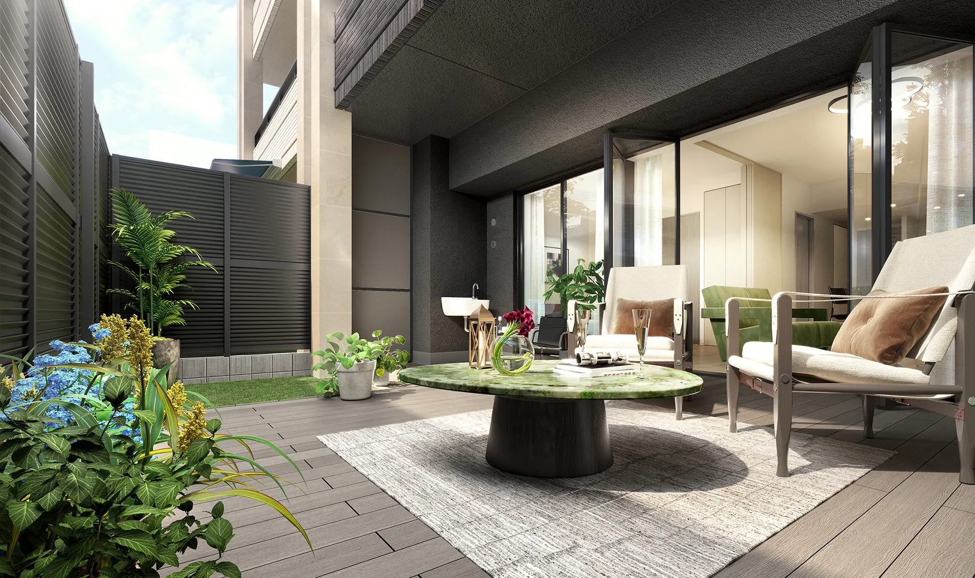 ※掲載のオーナーズサロン、オーナーズテラス完成予想CGは計画段階の図面を基に描いたもので、外観・外構・植栽・形状・仕上げ等は実際とは異なる場合があります。またタイルや各種部材の質感や色等は実際とは異なります。外観形状の細部や設備機器等は表現されておりません。行政指導や施工上の理由等のため今後変更となる場合がありますのであらかじめご了承ください。植栽は育成に必要な環境の下で竣工から一定期間を経た状態のものを想定して描いており、特定の季節を現したものではありません。家具・調度品等は変更となる場合があります。なお完成予想CGは敷地内のみを描いており、周辺建物・環境等は表現しておりません。管理規約により利用制限があります。