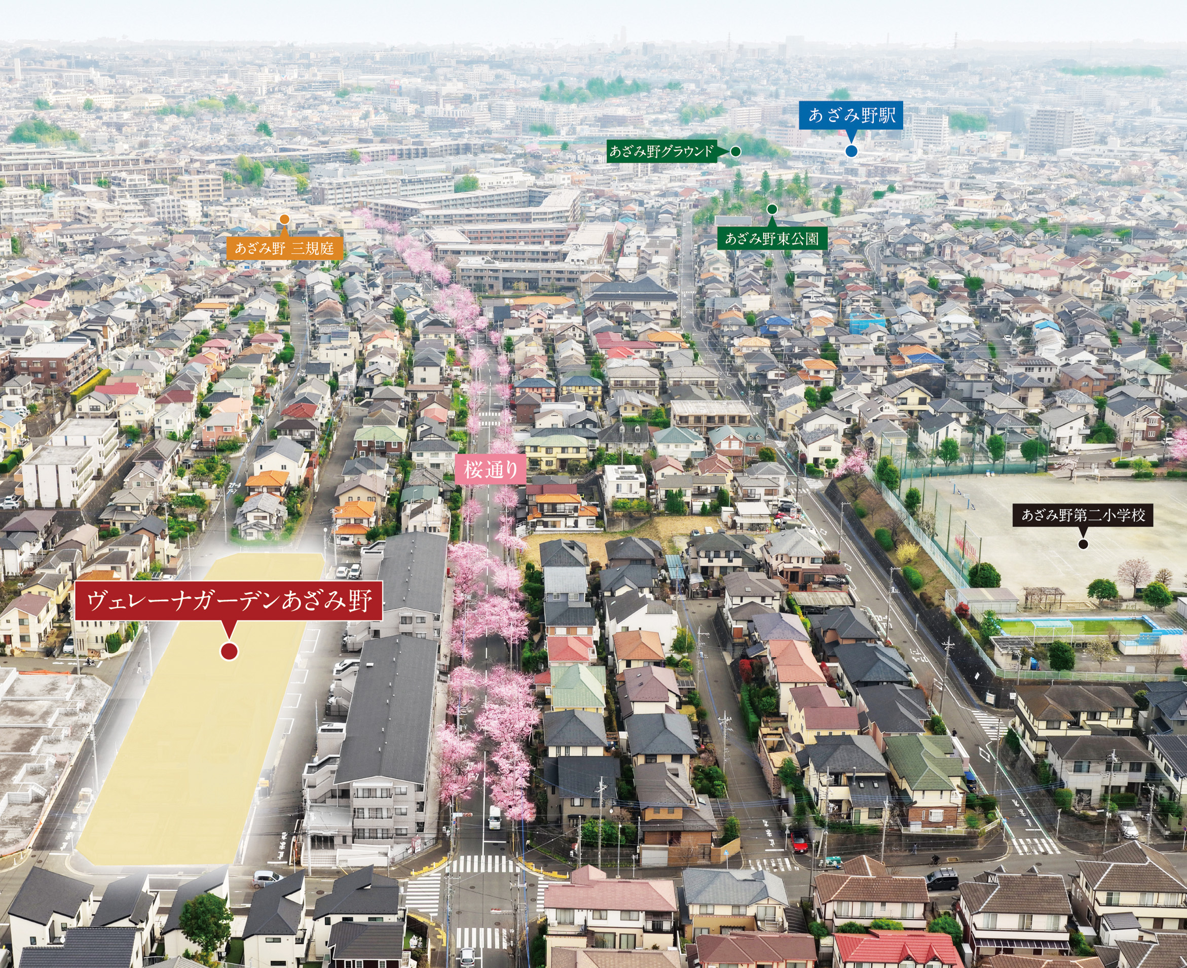 ※掲載の現地周辺の街並み写真は、2026年3月にドローンを使用して撮影したものに一部CG処理をしており実際とは多少異なります。また現地を示した光は、建物の高さや規模を表現したものではありません。周辺環境等は今後変更となる場合があり、将来に渡り保証されるものではありません。 ※掲載の完成予想CGは計画段階の図面を基に描いたもので、外観・外構・植栽・形状・仕上げ等は実際とは異なる場合があります。また各種部材の質感や色等は実際とは異なります。外観形状の細部や設備機器等は表現されておりません。行政指導や施工上の理由等のため今後変更となる場合がありますので予めご了承ください。植栽は育成に必要な環境の下で竣工から一定期間を経た状態のものを想定して描いており、特定の季節を表したものではありません。家具・調度品等は販売価格に含まれておりません。なお周辺建物・環境・電柱・電線・標識等は、2026年1月時点の情報を基に白線等で簡略化して表現しており、今後周辺環境が変化した場合等、将来に渡り保証されるものではありません。 ※距離表示については地図上の概測距離を、徒歩分数表示については80mを1分として算出し、端数を切り上げたものです。※掲載の周辺環境写真・動画は2026年3月~4月に撮影したものです。※掲載の情報は2025年12月現在のものです。 ※Image Photoの表記のある写真は全てイメージです。※全18戸のうち3戸(16~18号棟)は現在、許認可申請中です。