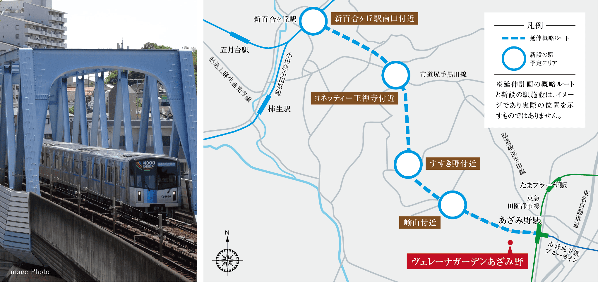 横浜市営地下鉄ブルーラインは、「あざみ野」駅から小田急線「新百合ヶ丘」駅をつなぐ延伸が進行中。