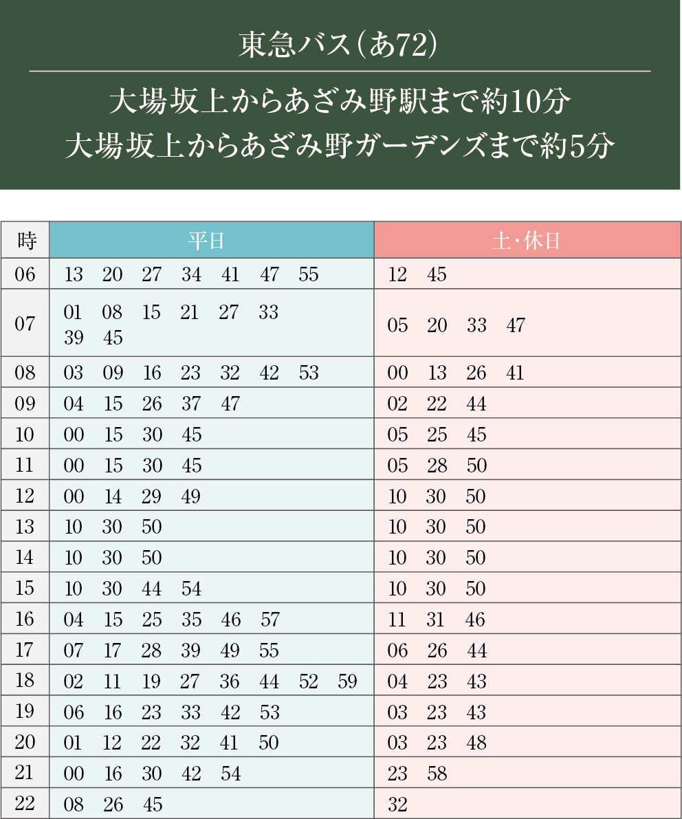 ※「あざみ野三丁目」バス停(徒歩3分~5分・17号棟~2号棟)、「大場坂上」バス停(徒歩3分~4分・2号棟~17号棟)