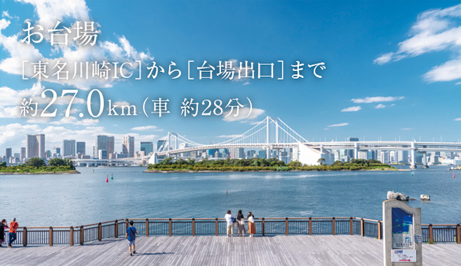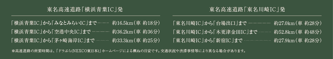 東名高速道路「横浜青葉IC」へ約2.2km、「東名川崎IC」へ約5.2km。神奈川県内や名古屋、