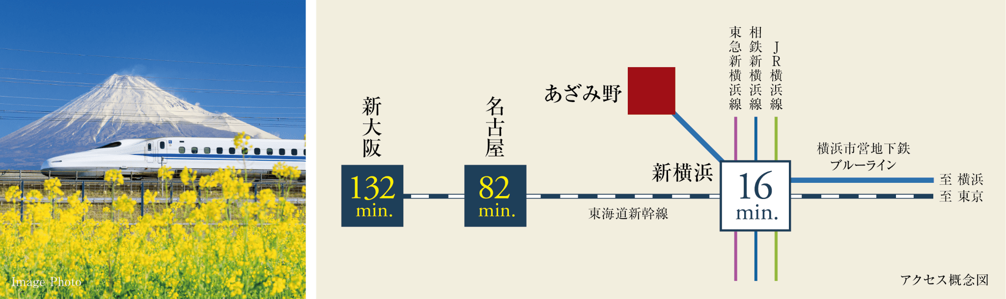 東海道新幹線が利用できる「新横浜」駅へ直通16分。関西方面への旅行や出張も軽快です。