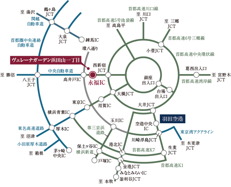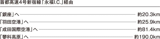 首都高速4号新宿線「永福」出入口まで約3.1km。都心方面へはもとより、中央自動車道で八王子や名古屋方面へのアクセスも軽快。高速道路のネットワークで行動エリアが大きく広がります。