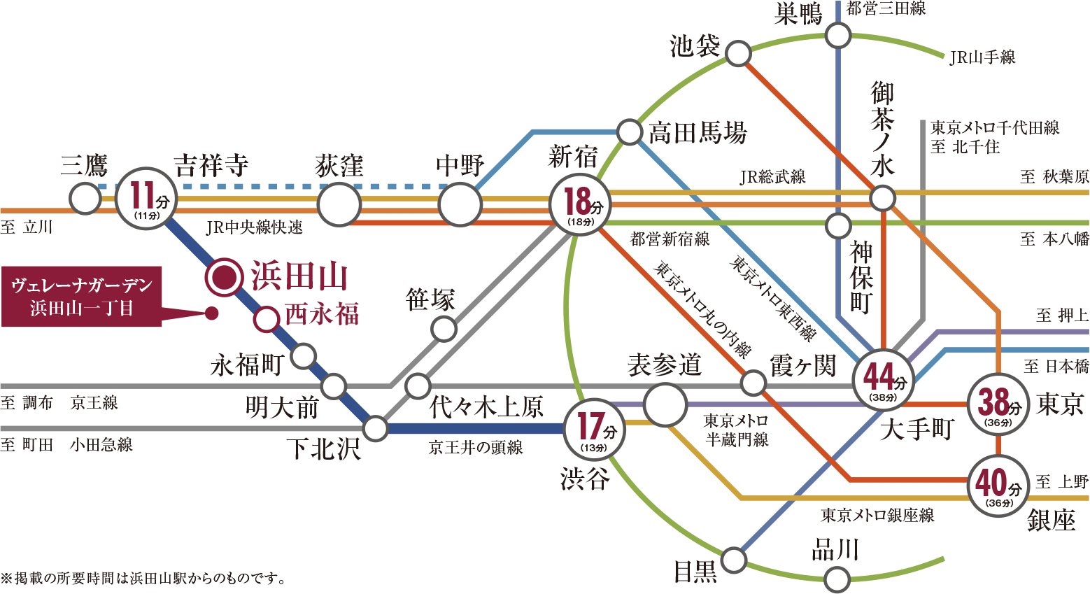 ※各駅への所要時間は通勤時に目的駅に到着する電車のうち、最も本数の多かった所要時間を表示しています。( )内は日中平常時の所要時間です。※乗換・待ち時間を含みます。※ジョルダン「乗換案内・時刻表・運行情報サービス」調べ。※通勤時=目的駅に7:30〜9:30着目安、日中時=目的駅に11:00〜16:00着目安としています。※掲載の情報は2025年10月現在のもので、ダイヤ改正等により今後変更になる場合があります。