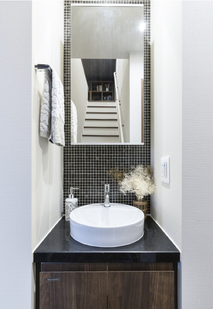 忙しい朝も快適に。三面鏡や豊富な収納といった使いやすさに加え、高級感のある人造大理石のカウンタートップ、モザイクタイルの採用など、デザインにも気を配りました。