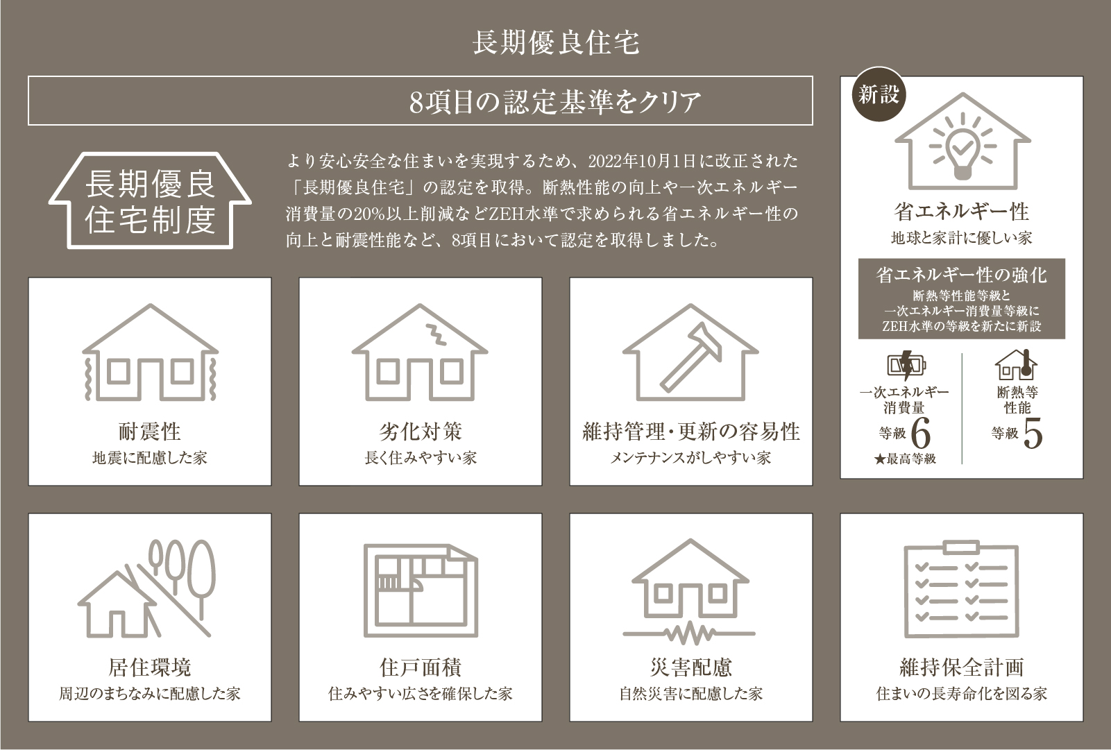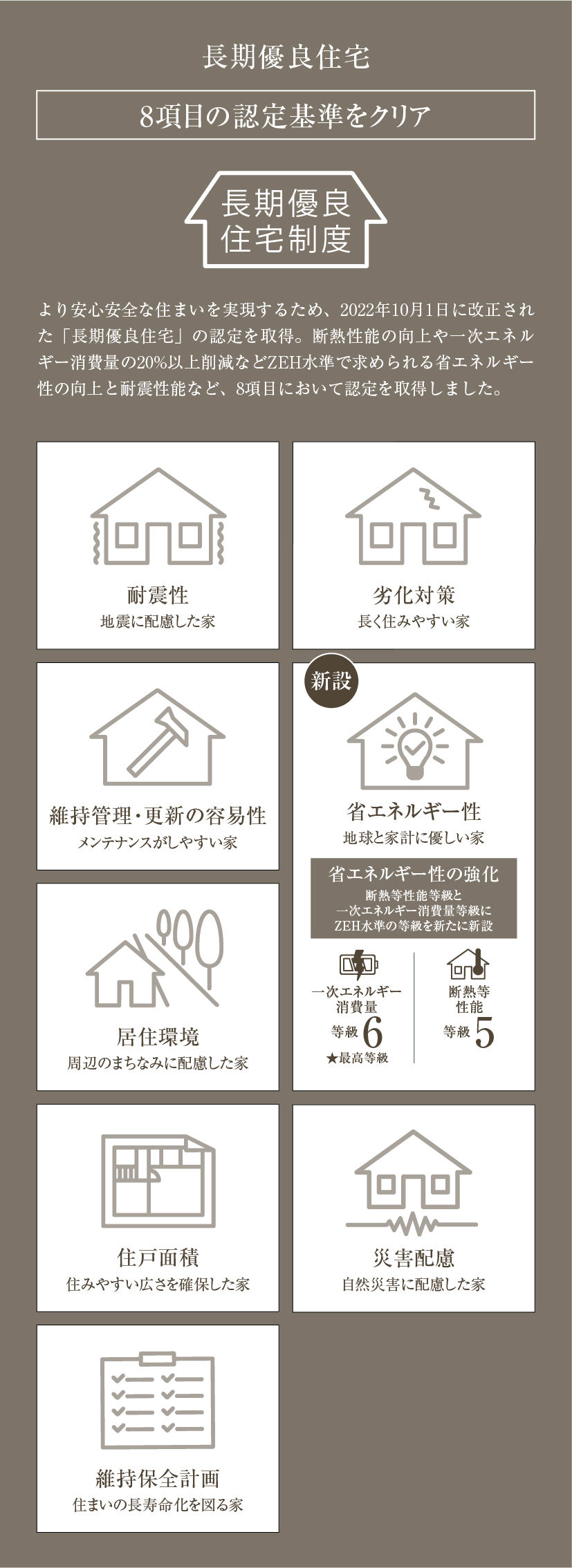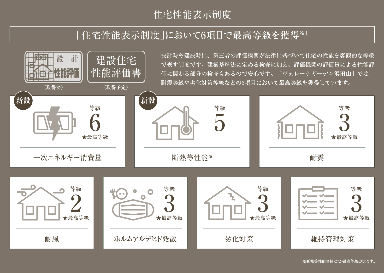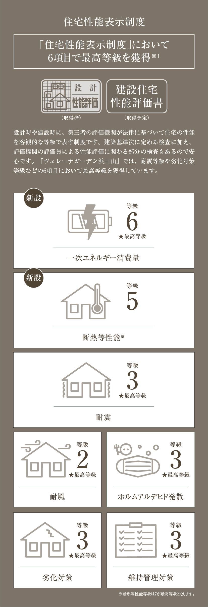 「ヴェレーナガーデン浜田山一丁目」では、ここに住まうすべての方が心地よく、安心して過ごせる住まいを目指し、長期優良住宅8項目クリアに加え、住宅性能表示制度では6項目で最高等級を獲得しました。