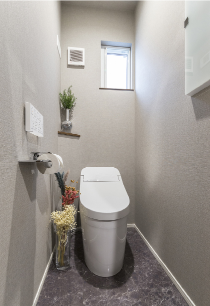 清潔感のある空間に。スマートな空間を演出するタンクレストイレ、1階トイレは「オート開閉・オート洗浄」機能を搭載した先進仕様。また、手洗いカウンターのボウルも水アカが付きにくく、お手入れのしやすい素材を採用しています。