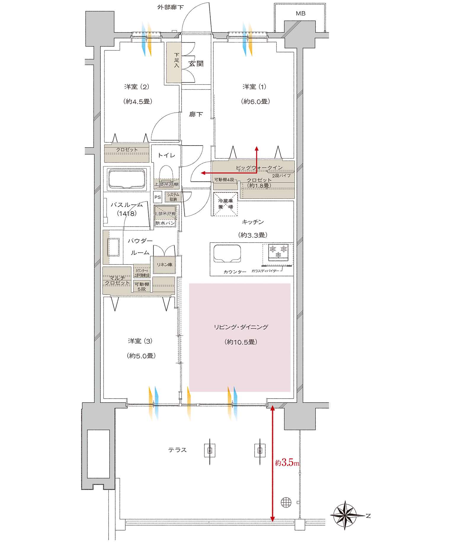 ※掲載の間取りは、計画段階の図面を基に簡略化して描き起こしたものです。施工上の理由等のため、今後変更になる場合があります。 ※リビング・ダイニング・キッチンの畳数表記については、リビング・ダイニング・キッチンの扉より内側の面積から、キッチンの面積を含んだもので算出しております。