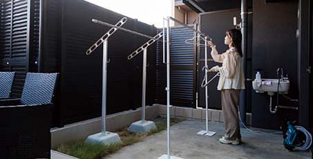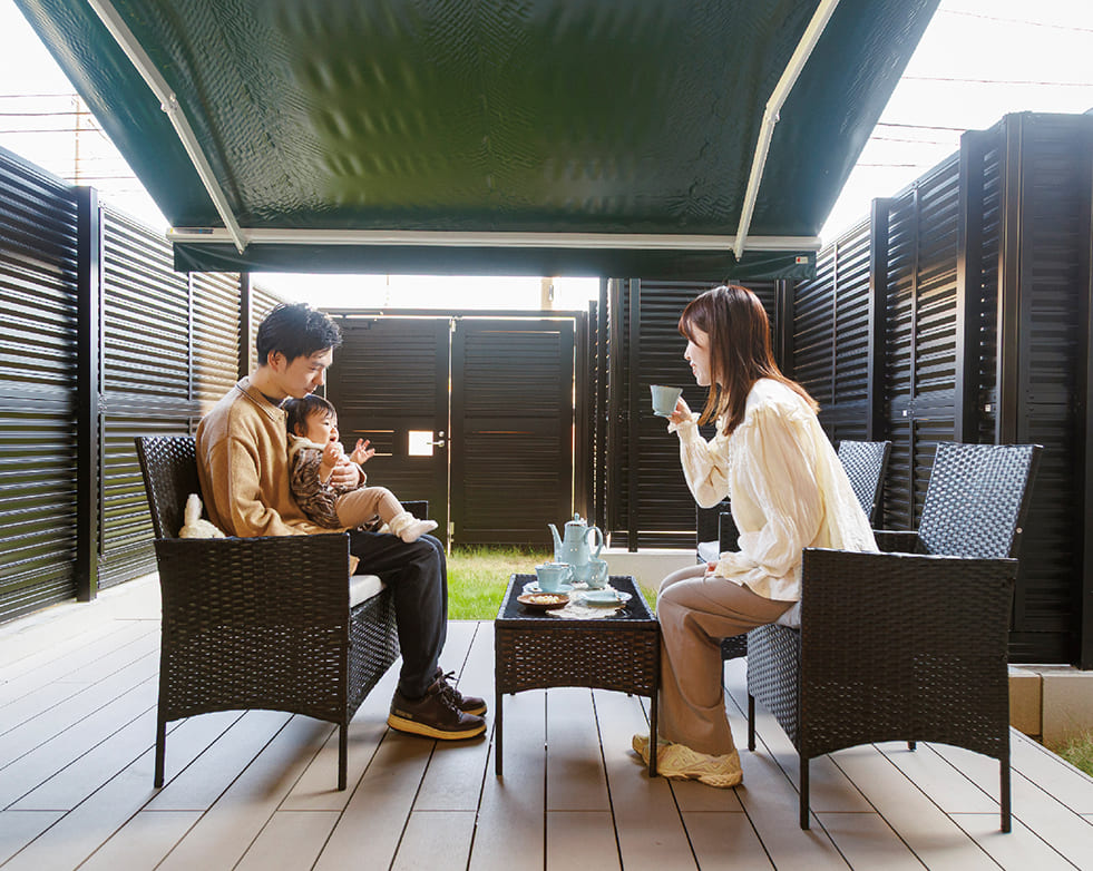 妻はお菓子作りが趣味で、アフタヌーンティーのセットがあるので、外で優雅なティータイムを楽しんでいます。姉家族が来た際にプール遊びをしたのですが、空間が広々しているので、甥っ子はすごく楽しそうでした。うちの子も大きくなったら、庭でもっと遊べますね。テラス部分が広いため、洗濯物が干しやすいところもいいですね。布団も心置きなく干せます。